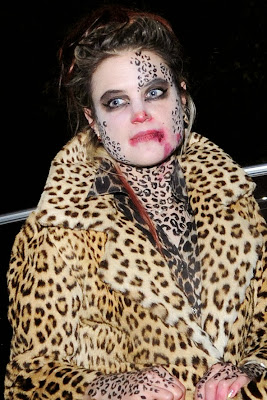 4. Leopárd-zombinő: Világos alapozó és púder/hintőpor. Orrhegyre piros rúzs elkenve, száj körül piros rúzs jól szétkenve, füstös szemek és fekete ceruzával rajzolt leopárd minták.